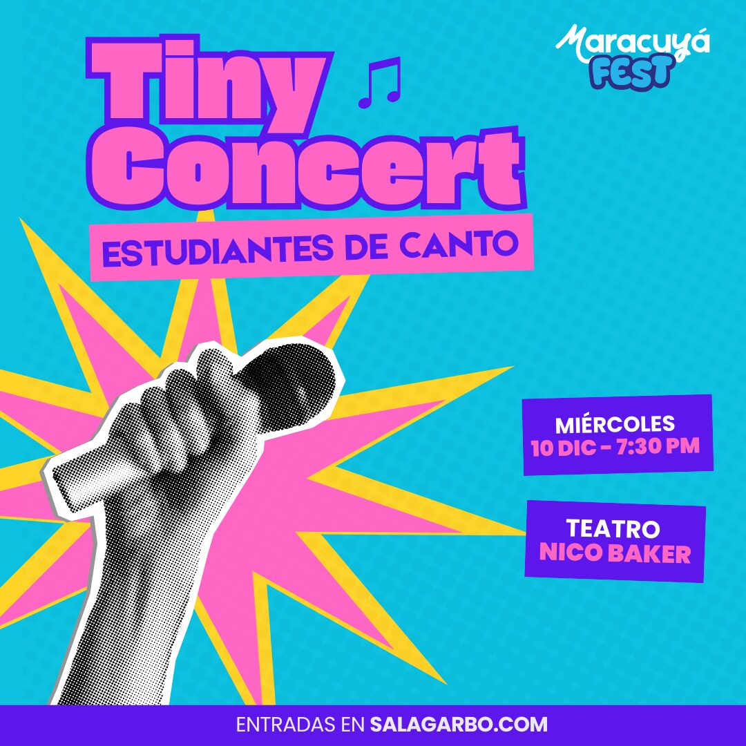 Tiny Concert es el concierto de cierre anual del Maracuyá Vocal Studio, donde nuestros estudiantes de canto presentan su muestra final del año. Será una noche llena de música en vivo, interpretada por voces en formación acompañadas por una banda profesional, ofreciendo un repertorio variado que incluye pop, rock, música en español e inglés.